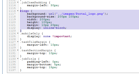 Next, you need to set the size of the logo. Look for the "Style.css" resource, and edit it. Scroll right to the bottom of the page to see the logo class, to edit the size of the logo: