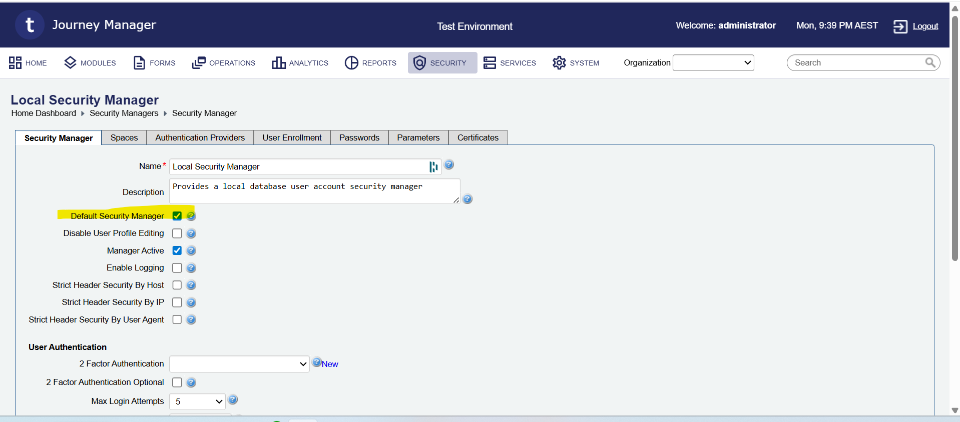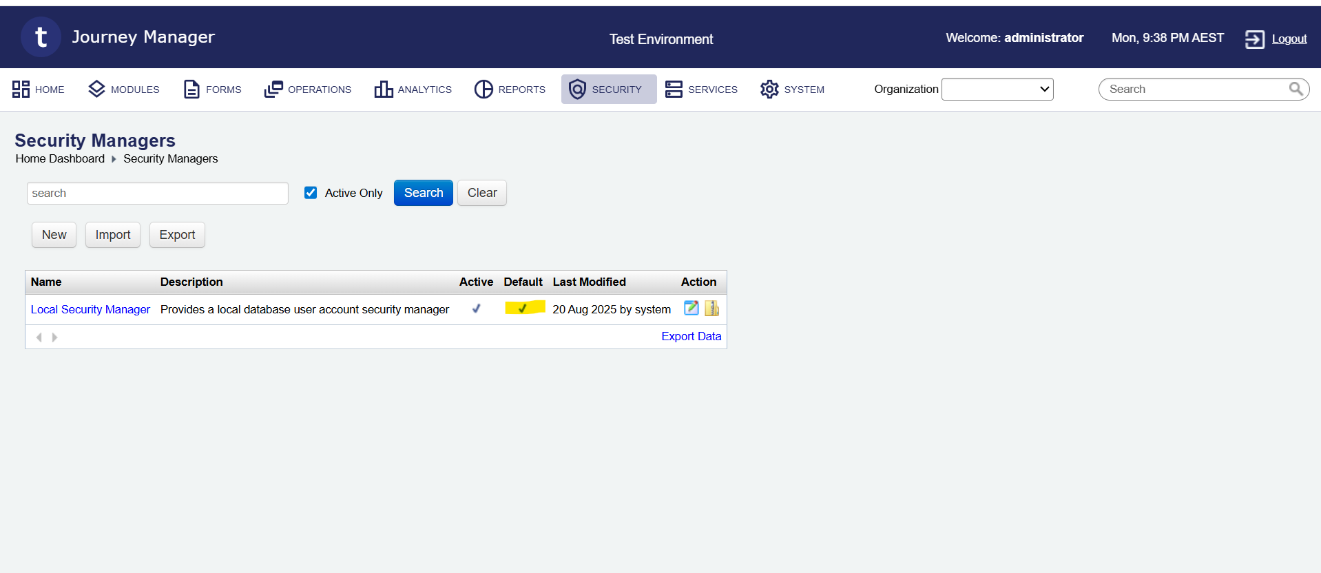 1. Navigate to the Security → Security Managers in Journey Manager (JM).