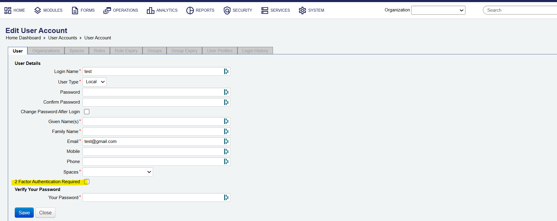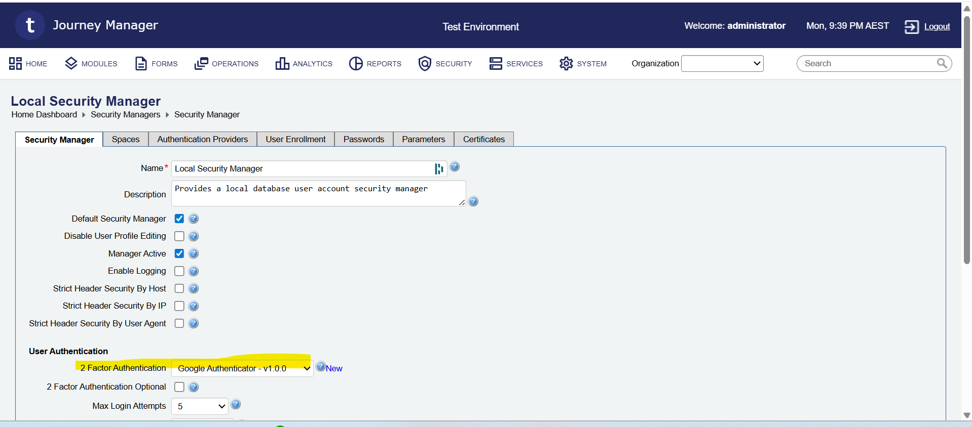 4. Select 'Google Authenticator - v1.0.0' in the '2 Factor Authentication' drop-down for the Local Security Manager.